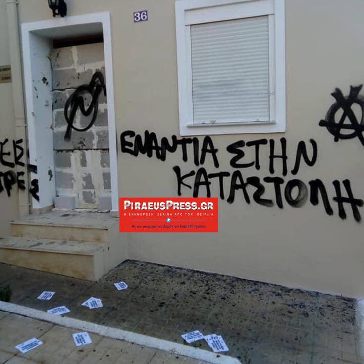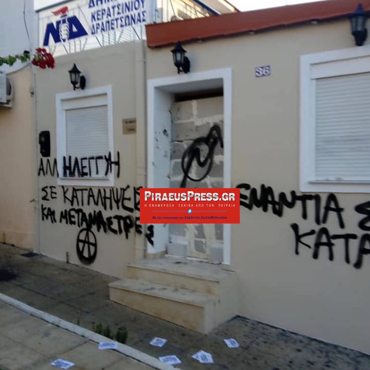 Αντιεξουσιαστές έγραψαν συνθήματα και πέταξαν τρικάκια σε κτίριο Τοπικής Οργάνωσης της Νέας Δημοκρατίας στην περιοχή του ευρύτερου Πειραιά.