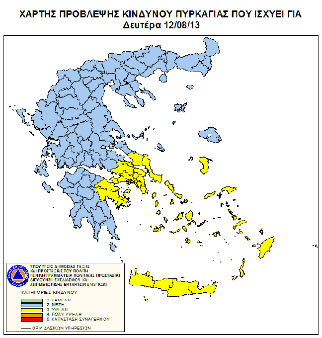 Σύμφωνα με το χάρτη που εκδίδει η Γενική Γραμματεία Πολιτικής Προστασίας του υπουργείου Προστασίας του Πολίτη, υψηλός είναι ο κίνδυνος πυρκαγιάς (κατηγορία κινδύνου 3) μεταξύ άλλων στα νησιά του Αιγαίου, την Κρήτη, την κεντρική και νότια Εύβοια, την Αττική και τμήμα της Πελοποννήσου.