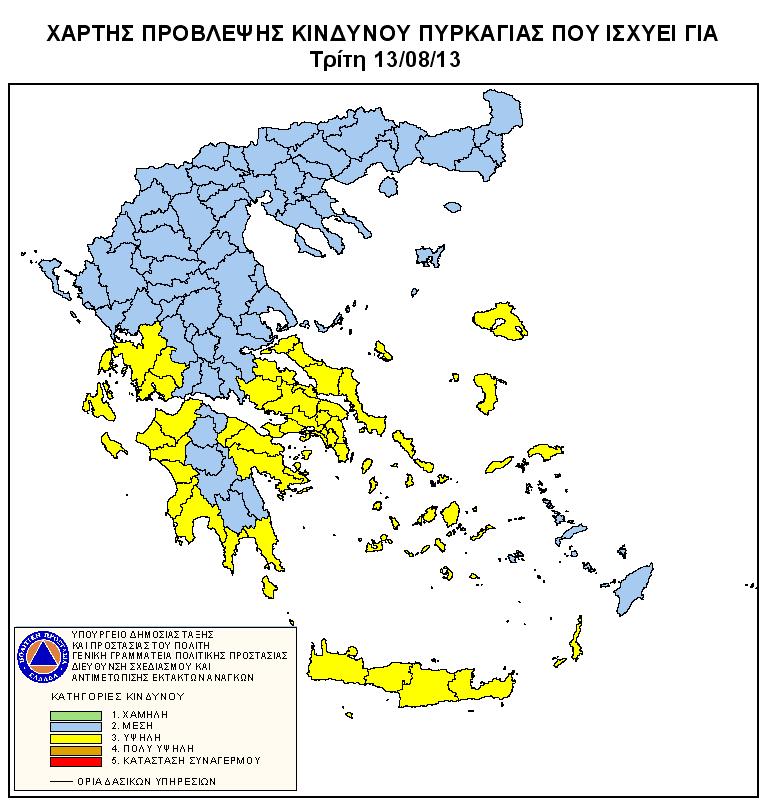 Υψηλό κίνδυνο πυρκαγιάς (κατηγορία κινδύνου 3) αντιμετωπίζουν μεταξύ άλλων νησιά του Αιγαίου, η Κρήτη, μεγάλο μέρος της Πελοποννήσου, η Εύβοια, η Αττική και τμήμα της δυτικής Ελλάδας.