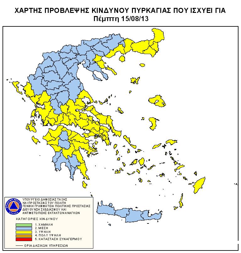 Υψηλός είναι ο κίνδυνος πυρκαγιάς (κατηγορία κινδύνου 3) μεταξύ άλλων στα νησιά του Αιγαίου και του Ιονίου, μεγάλο μέρος της Πελοποννήσου, η Αττική, η Εύβοια, η δυτική Ελλάδα και η Θράκη.