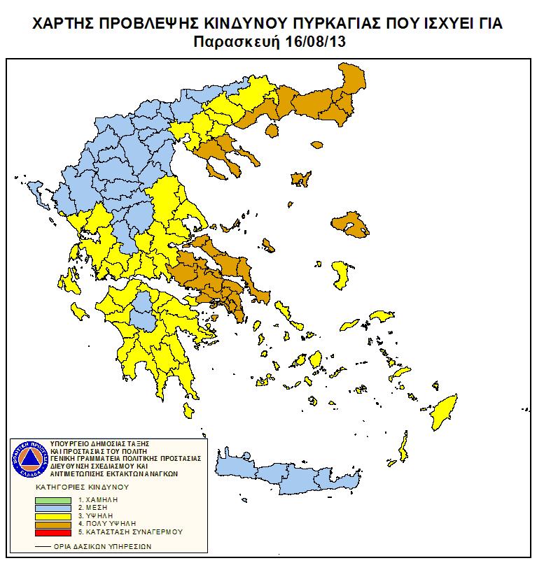 Προειδοποίηση για την ύπαρξη πολύ υψηλού κινδύνου εκδήλωσης πυρκαγιάς αύριο σε περιοχές της κεντρικής και βορειανατολικής Ελλάδας, εξέδωσε η Γενική Γραμματεία Πολιτικής Προστασίας. Σύμφωνα με τον Χάρτη Πρόβλεψης Κινδύνου Πυρκαγιάς για αύριο Παρασκευή 16 Αυγούστου 2013, προβλέπεται πολύ υψηλός κίνδυνος πυρκαγιάς (κατηγορία κινδύνου 4) για τις εξής περιοχές: