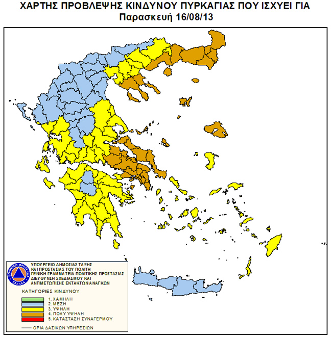 Πολύ υψηλός είναι σήμερα ο κίνδυνος πυρκαγιάς σύμφωνα με το Χάρτη Πρόβλεψης Κινδύνου Πυρκαγιάς που εκδίδει η Γενική Γραμματεία Πολιτικής Προστασίας.