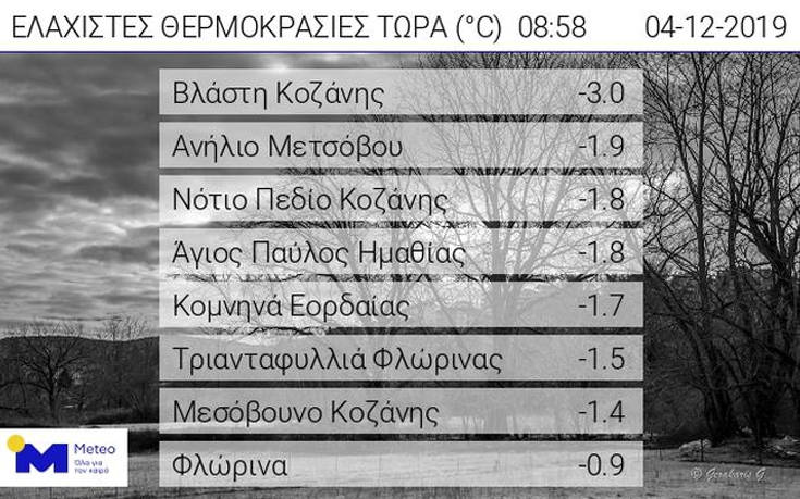 Παράλληλα, όπως φαίνεται και στον σχετικό πίνακα, αρνητικές ελάχιστες θερμοκρασίες και παγετός καταγράφηκαν στο σύνολο σχεδόν της Δυτικής Μακεδονίας, ενώ κοντά στους μηδέν βαθμούς πλησίασε η ελάχιστη θερμοκρασία και σε πολλές ακόμη περιοχές της Μακεδονίας και της Θράκης. Αξίζει να σημειωθεί ότι στους σταθμούς του δικτύου μας που λειτουργούν σε χιονοδρομικά κέντρα και καταφύγια (δεν περιλαμβάνονται στο σχετικό πίνακα) καταγράφηκαν ακόμη χαμηλότερες θερμοκρασίες, όπως για παράδειγμα στο Χ/Κ Καϊμακτσαλάν (-4,8) και στο καταφύγιο Λαϊλιά Σερρών (-3,3).