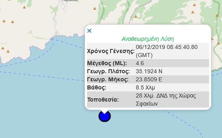 Το Γεωδυναμικό Ινστιτούτο υπολόγισε τον σεισμό στα 4,6 Ρίχτερ, 28 χλμ δυτικά-νοτιοδυτικά της χώρας των Σφακίων, με εστιακό βάθος στα 8,5 χλμ.