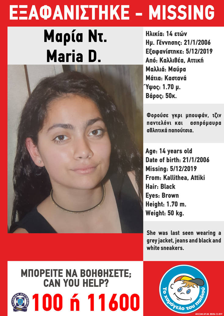 Σύμφωνα με την ανακοίνωση που εξέδωσε το «Χαμόγελο του Παιδιού» στις «05/12/2019 και ώρα 14:00, εξαφανίστηκε από την περιοχή της Καλλιθέας, η Μαρία Ντ., 14 ετών. «Το Χαμόγελο του Παιδιού» ενημερώθηκε για την εξαφάνιση της Μαρίας Ντ. σήμερα, 06/12/2019, απογευματινές ώρες και προχώρησε άμεσα στη δημοσιοποίηση των στοιχείων της. Η Μαρία Ντ. έχει ύψος 1.70 μ., ζυγίζει 50 κιλά, έχει μαύρα μαλλιά και καστανά μάτια. Την ημέρα που εξαφανίστηκε φορούσε γκρι μπουφάν, τζιν παντελόνι και ασπρόμαυρα αθλητικά παπούτσια».