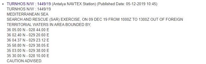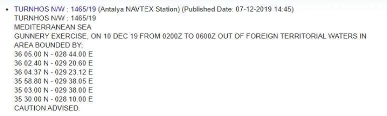 Το Σάββατο με νεότερη, εξίσου παράτυπη, NAVTEX δέσμευσε και για την Τρίτη την ίδια περιοχή, για άσκηση με την χρήση όπλων.