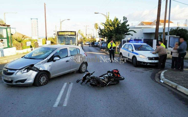 Από την πρόσκρουση ο οδηγός της μοτοσικλέτας βρέθηκε στο οδόστρωμα και παρελήφθη με ελαφρά τραύματα από ασθενοφόρο του ΕΚΑΒ.