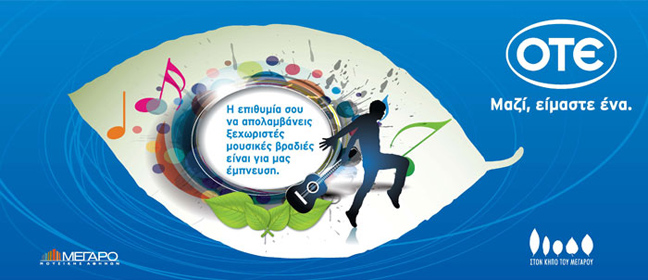 Πάντα κοντά σε σημαντικές καλλιτεχνικές και πολιτιστικές πρωτοβουλίες, ο ΟΤΕ προσφέρει στους συνδρομητές του το αποκλειστικό προνόμιο να αποκτήσουν εισιτήρια με έκπτωση 50% , για όποια συναυλία θέλουν να παρακολουθήσουν.
