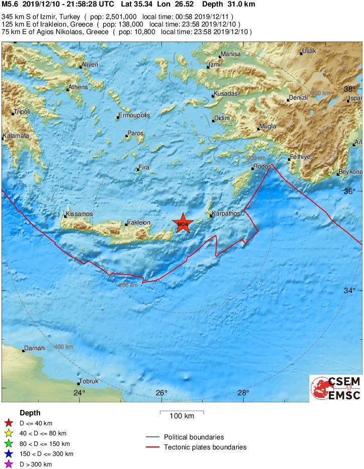 Σεισμός μεγέθους 5,5 ρίχτερ σημειώθηκε πριν από λίγα λεπτά ανατολικά του Αγίου Νικολάου στην Κρήτη. Το εστιακό βάθος της δόνησης ήταν 31 χιλιόμετρα και το επίκεντρο εντοπίζεται στη θαλάσσια περιοχή ανατολικά του Αγ. Νικολάου.