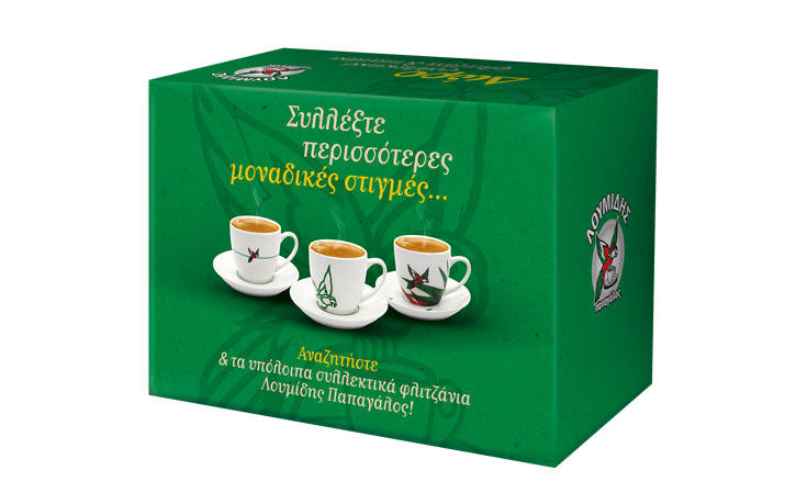 Μαζί με κάθε πολυσυσκευασία δύο πακέτων «Λουμίδης Παπαγάλος Παραδοσιακός 200γρ.» σας κάνει δώρο ένα από τα νέα του φλιτζάνια και το αντίστοιχο πιατάκι με την υπογραφή του για να τα κάνετε μέρος της συλλογής σας.
