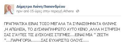 Συντετριμμένη από αυτήν την απώλεια, η Λιάνη Παπανδρέου ευχαρίστησε τους φίλους της στο Facebook για τη στήριξή τους γράφοντας το εξής: «Πραγματικά είναι τόσο μεγάλα τα συναισθήματα θλίψης, η απώλεια, το δυσαναπλήρωτο αυτό κενό, αλλά η στήριξή σας σε αυτές τις δύσκολες στιγμές… είναι μια “ζεστή” παρηγοριά… Σας ευχαριστώ όλους».