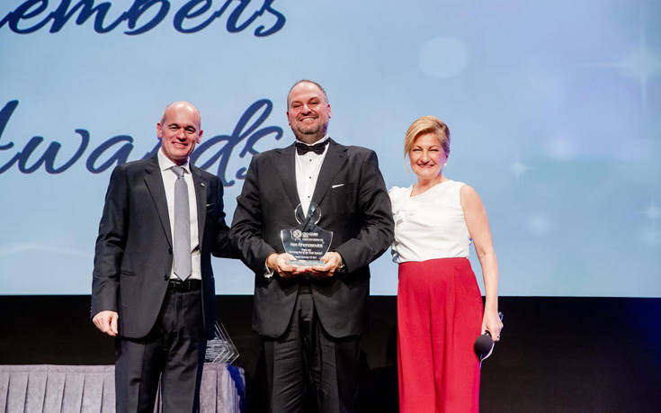 Η κ. Γεωργία Καρτσάνη, Ιδρυτής και Πρόεδρος του CEO Clubs Greece και ο κ. Γιώργος Σαγώνας, Γενικός Διευθυντής, βραβεύουν τον κ. Αλέξανδρο Αθανασούλα, CEO της Stirixis Group και μέλος του Advisory Board του Club