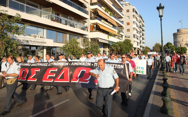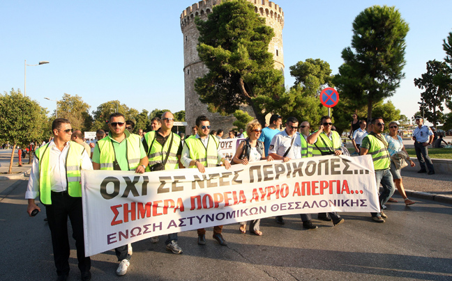 Ένστολοι, άνδρες και γυναίκες, συγκεντρώθηκαν μπροστά από το Λευκό Πύργο και στη συνέχεια κρατώντας πανό και φωνάζοντας συνθήματα εξέφρασαν την αντίθεσή τους στις περικοπές μισθών και συντάξεων. Οι διαδηλωτές πέρασαν έξω από τα γραφεία πολιτικών κομμάτων, όπου φώναξαν συνθήματα και επέδωσαν ψηφίσματα με τα αιτήματά τους, ενώ η πορεία των αστυνομικών, πυροσβεστών και λιμενικών, κατέληξε έξω από το κτίριο του υπουργείου Μακεδονίας – Θράκης.