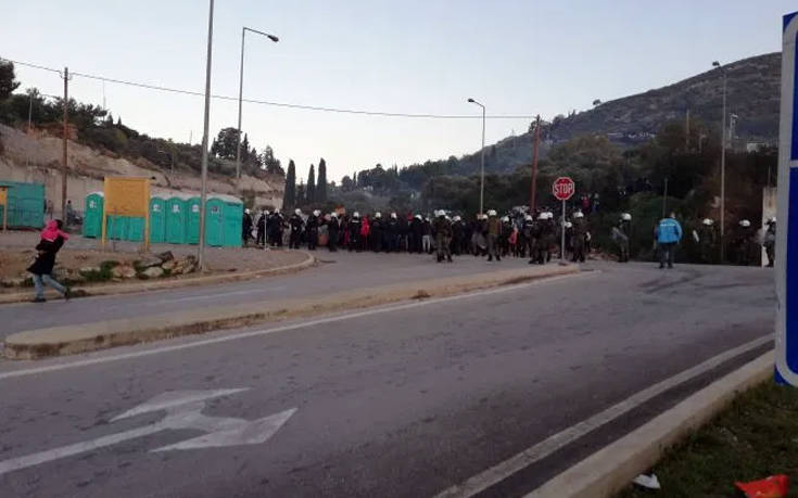 Από νωρίς το πρωί οι 300 μετανάστες είχαν διακόψει την κυκλοφορία των αυτοκινήτων, ενώ φώναζαν συνθήματα για να φύγουν από το νησί.
