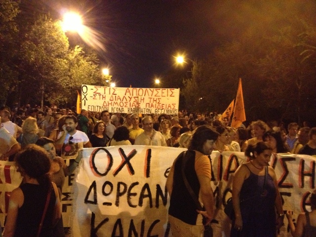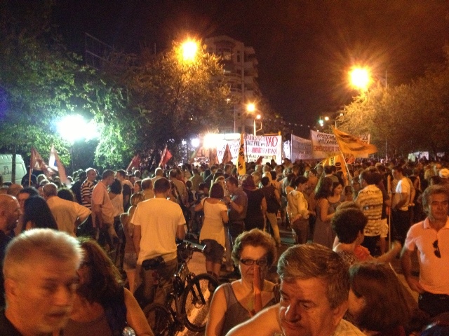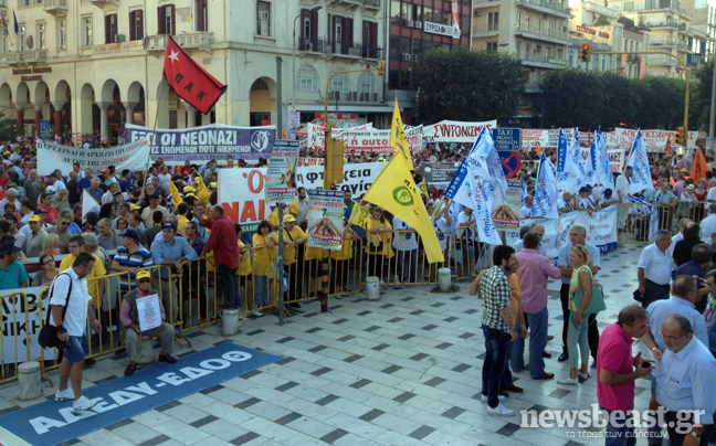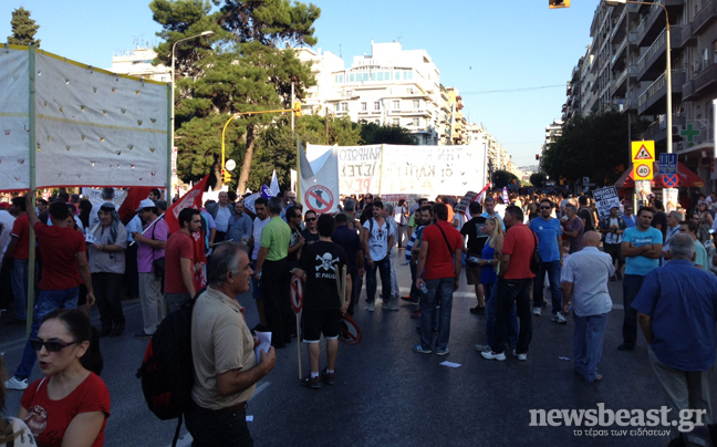 Στην Εγνατία οδό, μπροστά από το άγαλμα του Βενιζέλου, πραγματοποιήθηκε η κεντρική συγκέντρωση διαμαρτυρίας, που διοργανώθηκε από τη ΓΣΕΕ, την ΑΔΕΔΥ, το ΕΚΘ και την ΕΔΟΘ, με τη συμμετοχή σωματείων συνταξιούχων, εκπαιδευτικών και άλλων διαδηλωτών. Το «παρών» στο συλλαλητήριο έδωσε και ο πρόεδρος του ΣΥΡΙΖΑ Αλέξης Τσίπρας, επικεφαλής πολυμελούς αντιπροσωπείας βουλευτών και στελεχών του κόμματος. Ο αρχηγός της αξιωματικής αντιπολίτευσης μετέβη, στη συνέχεια στην ΕΤ 3, όπου συναντήθηκε με εργαζόμενους που παραμένουν εκεί και εκπέμπουν καθημερινά ενημερωτικό πρόγραμμα, το οποίο μεταδίδεται διαδικτυακά, ενώ στη συνέχεια παραχώρησε και συνέντευξη στο κανάλι.