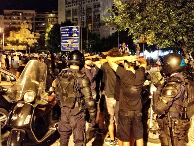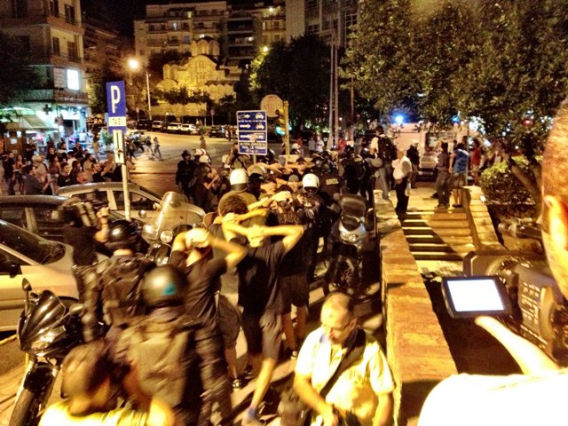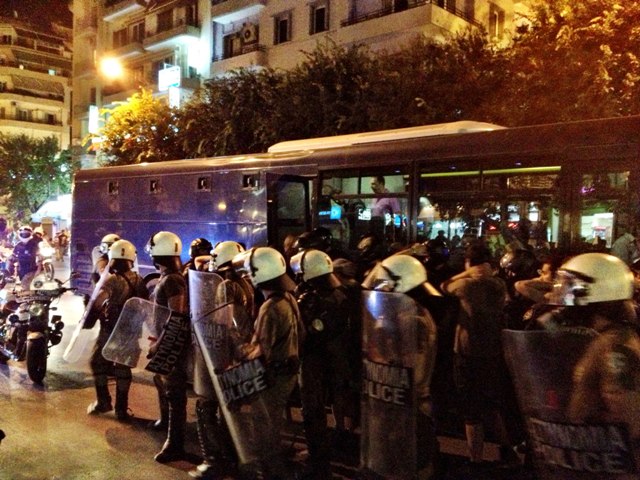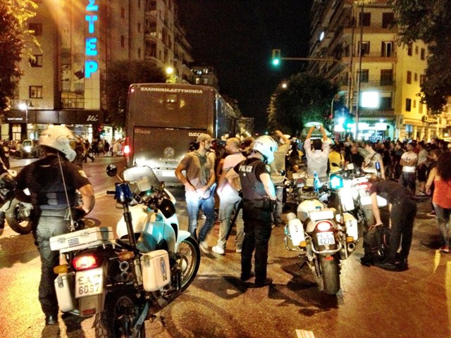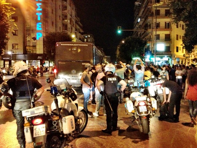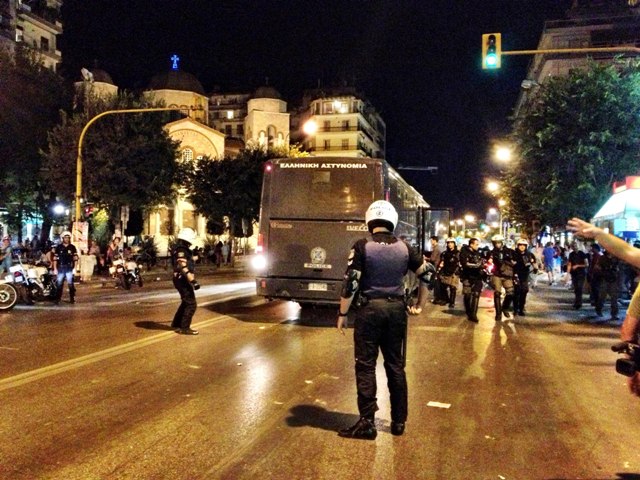 Οι διαδηλωτές έγραψαν συνθήματα σε ορισμένες τράπεζες και καταστήματα και, αφού έφτασαν στην πλατεία της ΧΑΝΘ, παρέμειναν εκεί για περίπου 20 λεπτά και στη συνέχεια επέστρεψαν, μέσω της οδού Αγγελάκη, στην Καμάρα. Εκεί, σημειώθηκε, λίγο αργότερα ένταση, όταν ορισμένοι από τους διαδηλωτές πέταξαν πέτρες προς τις δυνάμεις της Αστυνομίας, που «απάντησε» με χειροβομβίδες κρότου λάμψης. Ακολούθησε «κυνηγητό» στα στενά γύρω από τη Ροτόντα κι έγιναν, σύμφωνα την αστυνομία, 109 προσαγωγές και τρεις συλλήψεις.