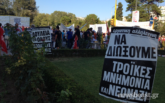Επιτροπές κατοίκων της Χαλκιδικής που αντιτίθενται στην εξόρυξη χρυσού στις Σκουριές, μαζί με αντιπροσωπεία κατοίκων του Κιλκίς που είναι αντίθετοι σε ανάλογη δραστηριότητα στο χωριό Κρούσια, κινήματα κατά των διοδίων, επιτροπές κατοίκων κατά του ΣΜΑ Ευκαρπίας και άλλοι διαδηλωτές, που συγκεντρώθηκαν στην πλατεία Αγίας Σοφίας, ενώθηκαν στη διάρκεια της πορείας τους με πρωτοβάθμια σωματεία και δυνάμεις της εξωκοινοβουλευτικής αριστεράς και του αντεξουσιαστικού χώρου, που είχαν συγκεντρωθεί νωρίτερα στην Καμάρα.