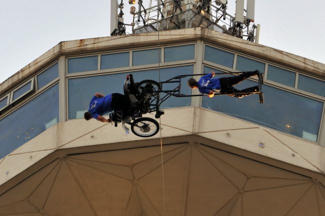 Ο 26χρονος Ράμπο Μπάγκλερ παρουσιάζει ένα από τα σόου του στην 78η Διεθνή Έκθεση Θεσσαλονίκης. Το σύρμα συνδέει το περίπτερο 7 με τον Πύργο του ΟΤΕ. Εκείνος οδηγεί τη μηχανή πάνω στο σύρμα και από κάτω αιωρείται ένας ακόμη ακροβάτης σε ειδική μπάρα (trapeze). Δεν υπάρχει δίχτυ ασφαλείας και ο κίνδυνος για τον αναβάτη της μηχανής είναι μεγάλος, αφού είναι ο μόνος που δεν είναι δεμένος στο σύρμα, για να μπορεί να κινείται ελεύθερα.