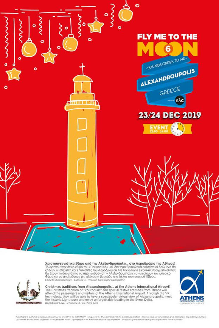 Η Αλεξανδρούπολη είναι ο ενδέκατος προορισμός του προγράμματος «Fly me to the Moon-Sounds Greek to Me!» που συνεχίζεται Δευτέρα 23 & Τρίτη 24 Δεκεμβρίου, με ακόμη περισσότερες εικόνες από την Ελλάδα! Το χριστουγεννιάτικο έθιμο του «Πουρπούρη», μαζί με άλλα ιδιαίτερα θρακιώτικα εορταστικά δρώμενα, παρουσιάζονται και συστήνονται στους επιβάτες και επισκέπτες του αεροδρομίου, σε μία ημέρα αφιερωμένη στην πολιτιστική και γαστρονομική παράδοση της περιοχής.