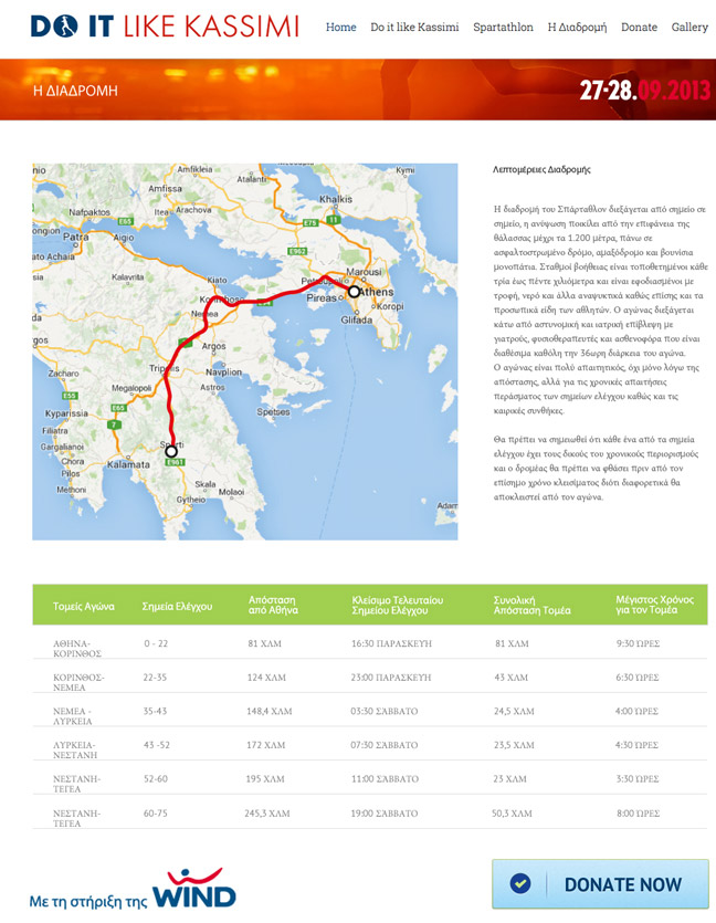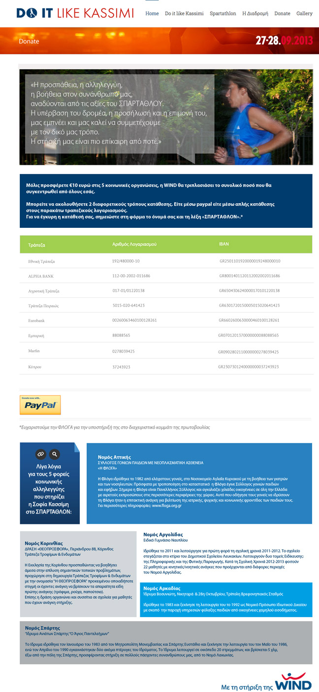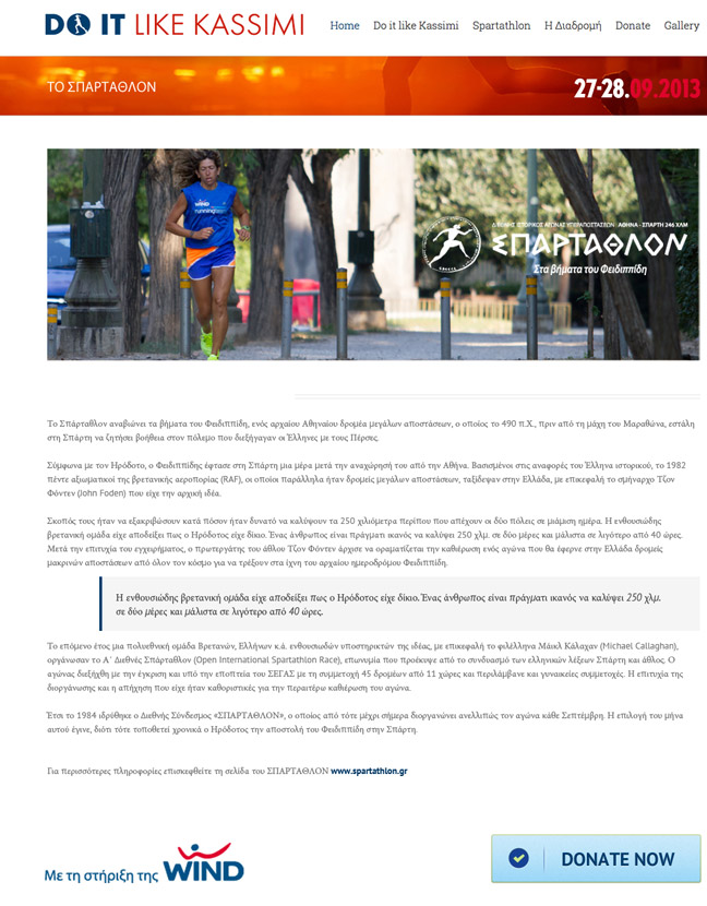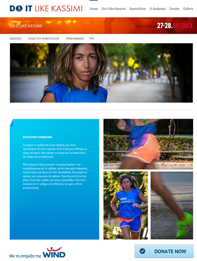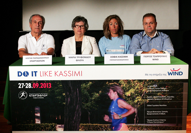 Η υπερ-μαραθωνοδρόμος αποδέχτηκε την πρόσκληση της WIND να τρέξει για 3η φορά έναν από τους δυσκολότερους αγώνες δρόμου στον κόσμο, προκειμένου να στείλει ένα δυνατό μήνυμα προσφοράς και κοινωνικής αλληλεγγύης. Έτσι, στις 27 Σεπτεμβρίου θα βρεθεί στην γραμμή εκκίνησης του Σπάρταθλον προκειμένου να συγκεντρώσει χρήματα για 5 κοινωνικούς φορείς. Η προσπάθεια της Σοφίας Κασσίμη καθώς και ο μηχανισμός μέσα από τον οποίο θα γίνονται οι δωρεές από κάθε ενδιαφερόμενο περιγράφεται στο www.doitlikekassimi.gr που δημιουργήθηκε για το σκοπό αυτό.