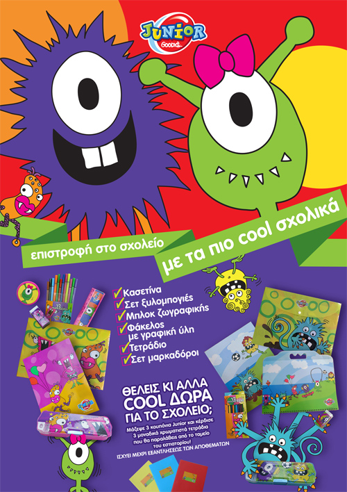 Μέχρι και τις 26 Σεπτεμβρίου, με την αγορά κάθε γεύματος Junior, τα εστιατόρια Goody’s προσφέρουν στους μαθητές τα πιο cool σχολικά είδη: τετράδια, κασετίνες, μαρκαδόρους, μπλοκ ζωγραφικής, φακέλους με γραφική ύλη, ξυλομπογιές. Επιπλέον, οι φίλοι του Junior με 3 γεύματα κερδίζουν 3 μοναδικά χρωματιστά τετράδια για την επιστροφή τους στο σχολείο!
