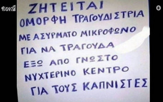 «Ζητείται όμορφη τραγουδίστρια με ασύρματο μικρόφωνο για να τραγουδά έξω από γνωστό νυχτερινό κέντρο για τους καπνιστές» αναφέρει η «αγγελία», η οποία παρουσιάστηκε και στην εκπομπή «Καλημέρα Ελλάδα» στον Αντέννα.