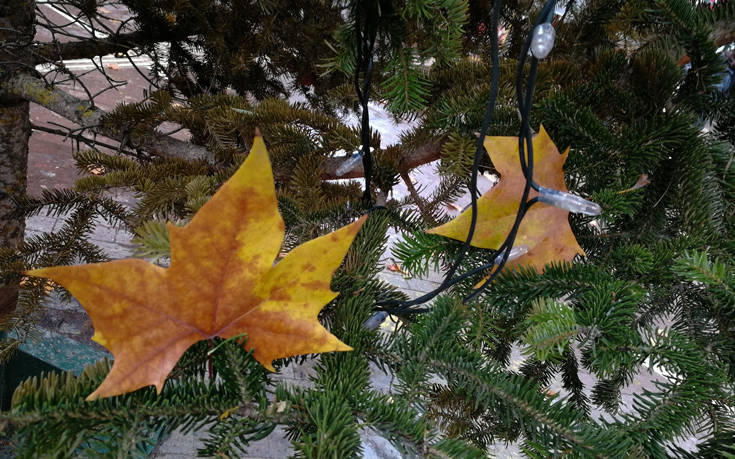 Έτσι λοιπόν ήρθε ένας… «εναλλακτικός» στολισμός, τόσο στο άγαλμα που υπάρχει στην πλατεία, όσο και σε ό,τι απέμεινε από το καμένο έλατο.