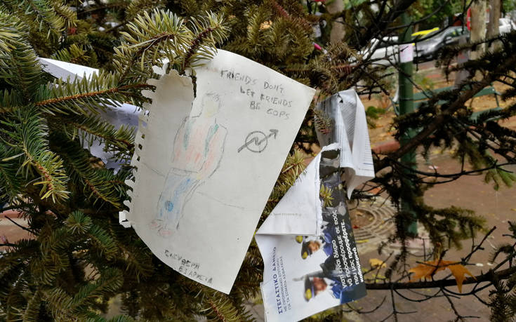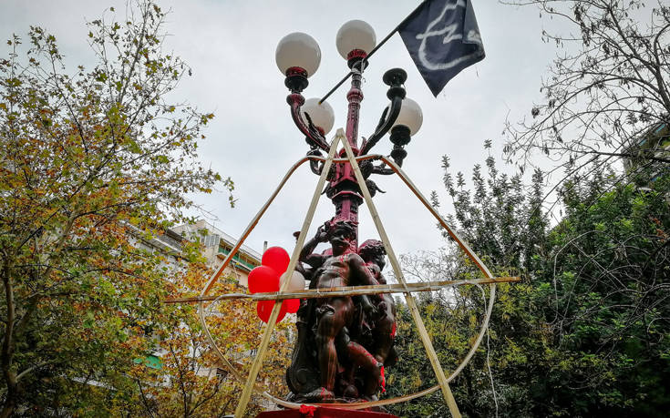 Στο άγαλμα τοποθετήθηκε το σύμβολο της αναρχίας «Α», ενώ στο έλατο τοποθετήθηκαν σημειώματα με συνθήματα όπως «λευτεριά σε όσους είναι στα κελιά» και «κράτος και παρακράτος δεν μας φοβίζουν μας εξοργίζουν».
