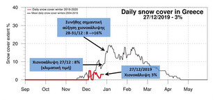 Στις 27 Δεκεμβρίου ήταν μόλις 3%, ενώ την τελευταία 15ετία ο μέσος όρος του ποσοστού χιονοκάλυψης για την ίδια ημερομηνία στη χώρα μας ανέρχεται στο 8%.