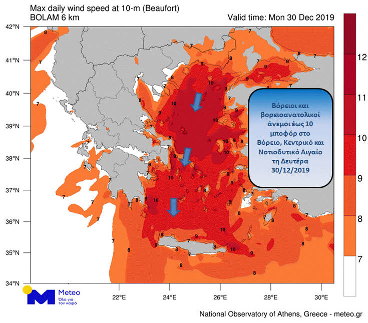 Οι άνεμοι στο Βόρειο, Κεντρικό και Νοτιοδυτικό Αιγαίο θα πνέουν από βόρειες και βορειανατολικές διευθύνσεις με εντάσεις που κατά τόπους θα φτάνουν τα 10 μποφόρ. Στον χάρτη που ακολουθεί φαίνονται οι περιοχές όπου η ένταση του ανέμου θα ξεπεράσει τα 7 μποφόρ.