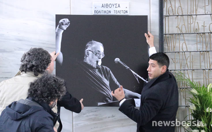 Η πολιτική κηδεία του ξεκίνησε λίγο μετά τις 14:30 με τη μουσική από το «Για το φτωχό Β.Β.» και τον στίχο «εγώ ο Μπέρτολτ Μπρέχτ από τα μαύρα δάση», σύνθεση του ίδιου του Θάνου Μικρούτσικου, παρουσία του Προέδρου της Δημοκρατίας Προκόπη Παυλόπουλου, του προέδρου του ΣΥΡΙΖΑ, Αλέξη Τσίπρα και του γγ της ΚΕ του ΚΚΕ, Δημ. Κουτσούμπα.