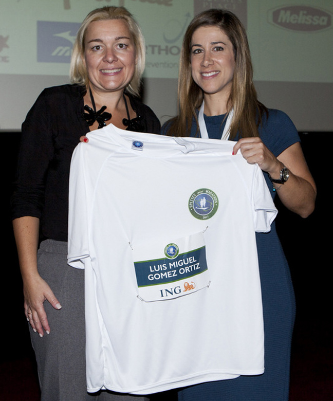 Αριστερά η κα Μαρίνα Κουταρέλλη, Πρόεδρος της Οργανωτικής Επιτροπής του Spetses Mini Marathon παραδίδει στην κα Κατερίνα Μολφέτα, Διευθύντρια Επικοινωνίας της ING Ελλάδος το συλλεκτικό – αναμνηστικό μπλουζάκι του αγώνα με το όνομα του CEO της ING κο. Luis Miguel Gomez Ortiz.