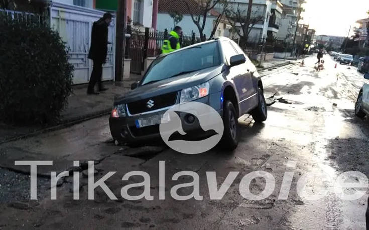 Όπως κατέγραψε το trikalavoice.gr λίγο μετά τις 7 π.μ. έσπασε αγωγός της ΔΕΥΑΤ που διέρχεται από τον συγκεκριμένο δρόμο, με αποτέλεσμα αυτός να ανοίξει στα δυο και να καταπιεί-κυριολεκτικά-διερχόμενο όχημα.
