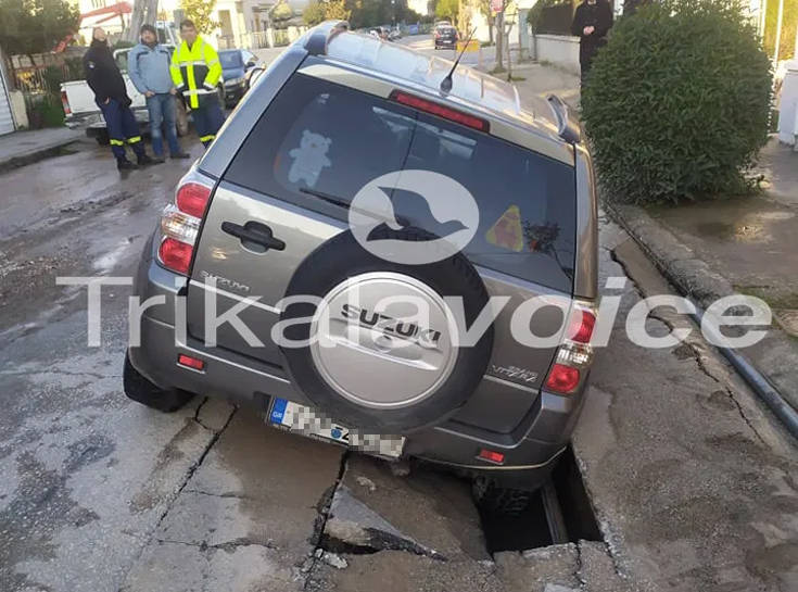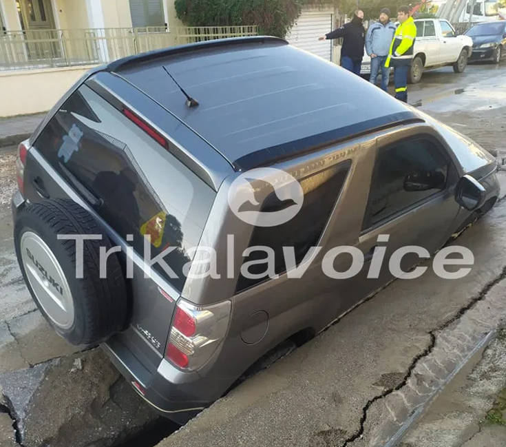 Όπως φαίνεται και στις φωτογραφίες, αλλά και στα βίντεο του trikalavoice.gr το όχημα βούλιαξε μέσα στο άνοιγμα του δρόμου, έχοντας υποστεί σημαντικές υλικές ζημιές.