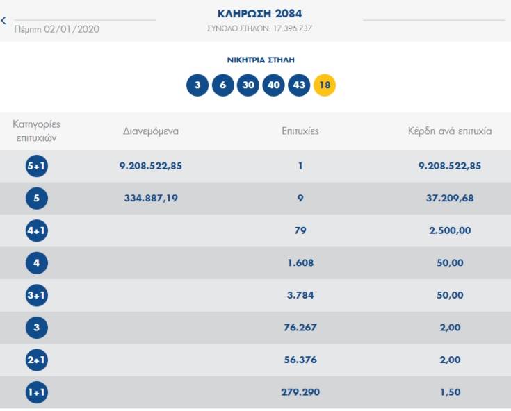 Όπως ανακοίνωσε ο ΟΠΑΠ μόνο ένα δελτίο είναι εκείνο που κερδίζει συγκεκριμένα 9.208.522,85 ευρώ, ενώ επίσης βρέθηκαν 9 επιτυχίες στη δεύτερη κατηγορία (5+1) με το ποσό που παίρνει ο κάθε νικητής να είναι 37.209,68 ευρώ.