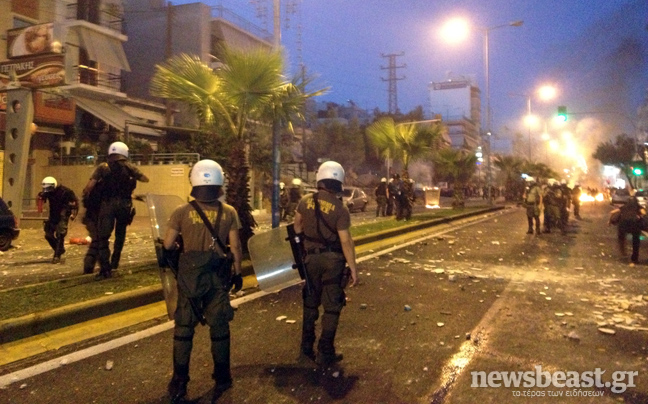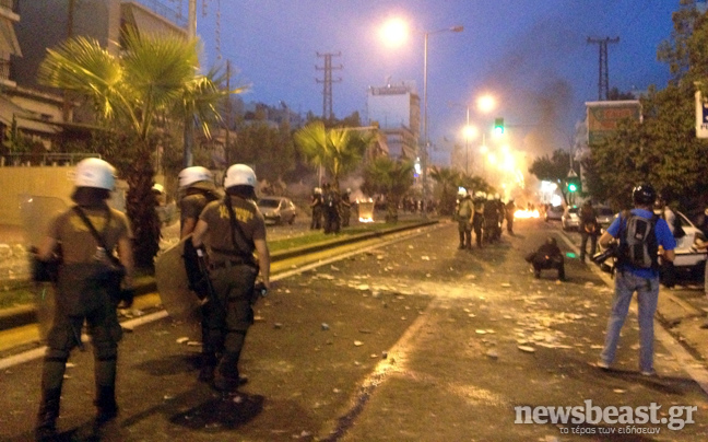 Όπως ανέφερε η αστυνομία, στη συγκέντρωση πήραν μέρος τουλάχιστον 10.000 άτομα. Το ελικόπτερο της αστυνομίας πετάει όλη αυτή την ώρα πάνω από το σημείο όπου γίνονται τα επεισόδια