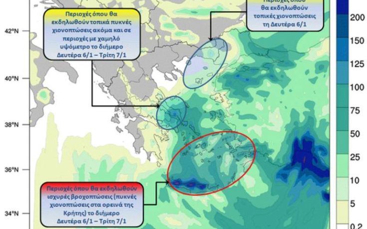 Στο χάρτη που ακολουθεί απεικονίζεται ο προβλεπόμενος συνολικός υετός (βροχή / χιόνι) έως το βράδυ της Τρίτης 7/1, ενώ επισημαίνονται οι περιοχές όπου θα εκδηλωθούν τα σημαντικότερα φαινόμενα.