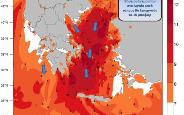 Παράλληλα, όπως φαίνεται και στον παρακάτω χάρτη, στα νοτιοανατολικά ηπειρωτικά, στην Εύβοια και στο Αιγαίο θα πνέουν βόρειοι άνεμοι με εντάσεις που θα φτάνουν και τοπικά θα ξεπερνούν τα 10 μποφόρ.