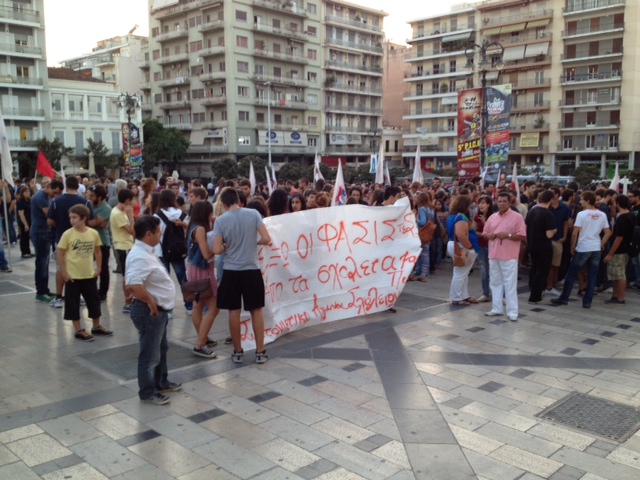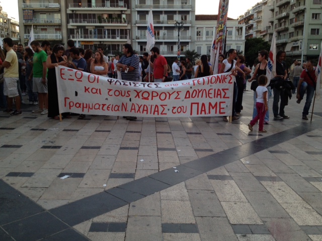 Αντιφασιστική συγκέντρωση και πορεία διαμαρτυρίας πραγματοποίησαν απόψε μέλη του ΠΑΜΕ στην Πάτρα σε ένδειξη διαμαρτυρίας για τη δολοφονία του Παύου Φύσσα.