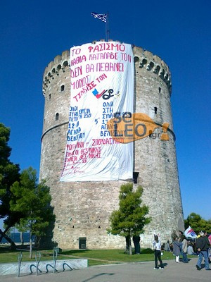 Τον έχουν περικυκλώσει και πάνω του έχουν κρεμάσει πανό με συνθήματα κατά της Χρυσής Αυγής. Πιο συγκεκριμένα, το πανό γράφει: «Τον φασισμό βαθιά κατάλαβέ τον, δεν θα περάσει μόνος του τσάκισέ τον».