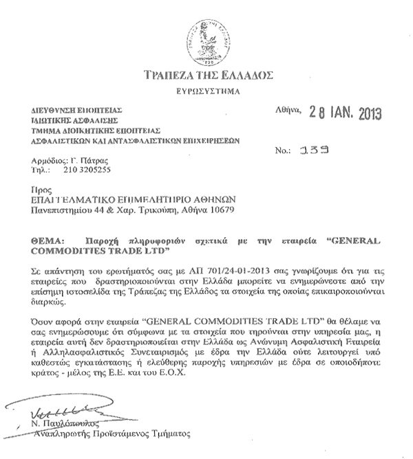 Όπως αναφέρεται στην επιστολή: «Εδώ και εννέα μήνες δραστηριοποιείται στην Ελλάδα μια ασφαλιστική εταιρία-φάντασμα υπό την επωνυμία GENERAL COMMODITIES TRADE PART OF LEV INS.