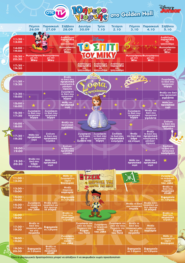 Σε ένα 10ήμερο γιορτής, μικροί και μεγάλοι θα έχουν τη δυνατότητα να συναντήσουν τους αγαπημένους τους Μίκυ και Μίνι του Disney Junior και να φωτογραφηθούν μαζί τους. Επίσης, θα μπορούν να ταξιδέψουν στο μαγικό κόσμο της Πριγκίπισσας Σοφίας και του Πειρατή Τζέικ, να παίξουν, να ζωγραφίσουν και να δημιουργήσουν, αλλά και να ψυχαγωγηθούν με τα καλύτερα παραμύθια της Disney.
