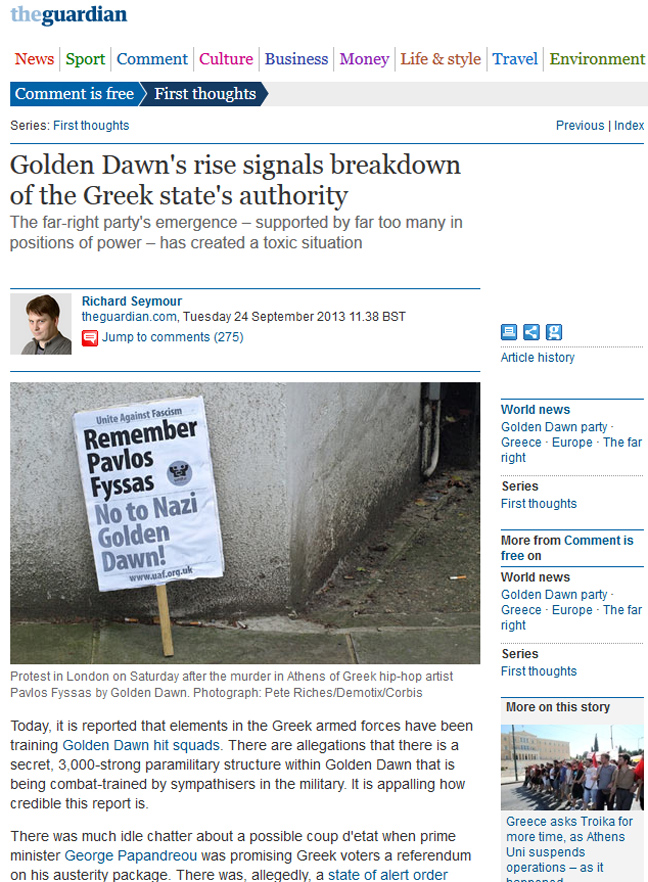 Ο δημοσιογράφος Richard Seymour επισημαίνει τα δημοσιεύματα περί εκπαίδευσης μελών της Χρυσής Αυγής από στελέχη των Ενόπλων Δυνάμεων και περί «κρυφού στρατού» 3.000 ατόμων που εκπαιδεύεται από συμπαθούντες μέσα στο στρατό και θυμίζει τις φήμες για πραξικόπημα επί πρωθυπουργίας Γιώργου Παπανδρέου.
