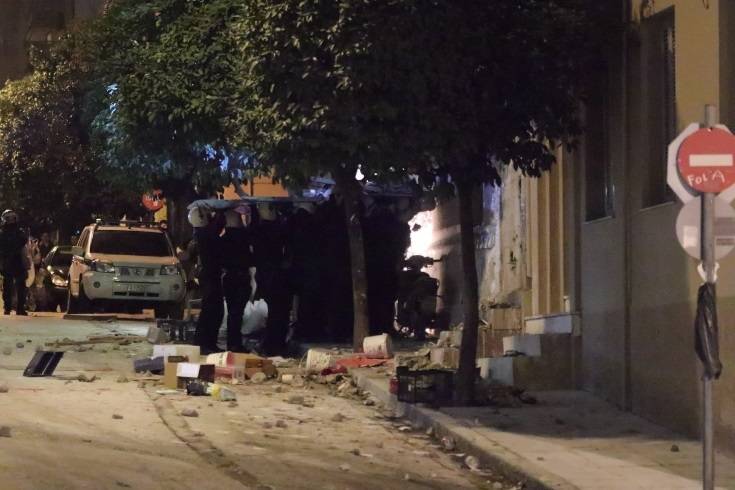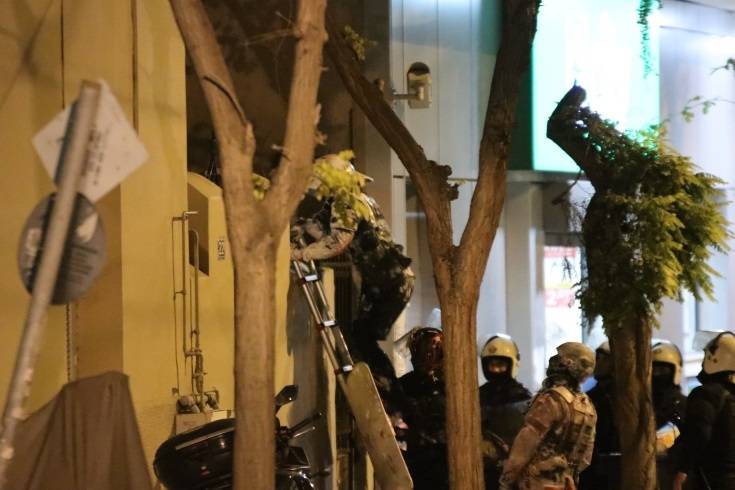 Οι άνδρες της αστυνομίας προσπαθούν με τροχό να ανοίξουν την πόρτα, ενώ επιχειρούν και από τις δύο πλευρές του κτιρίου, εντός του οποίου βρίσκονται αντιεξουσιαστές.