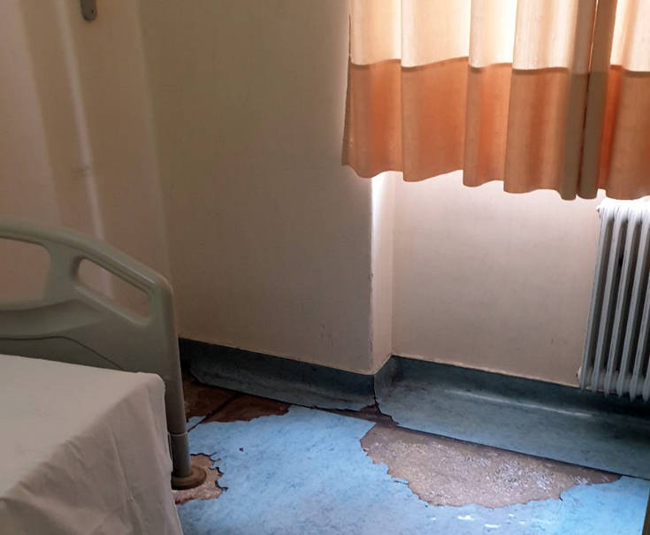 Θάλαμοι Νοσηλείας σε κακή κατάσταση, κρεβάτια χαλασμένα, πλυντήρια – λεβητοστάσιο – μαγειρεία που στεγάζονται σε ετοιμόρροπους χώρους, έλλειψη εξόδων κινδύνου, καμία πυρασφάλεια, καθόλου φύλαξη.