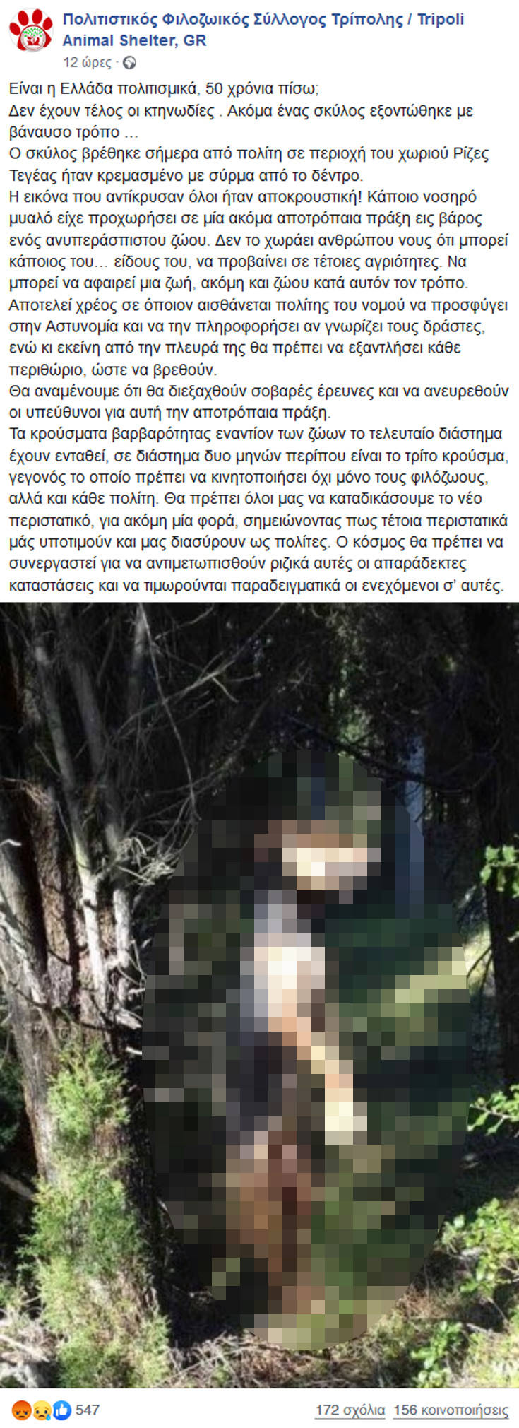Την είδηση έκανε γνωστή ο Πολιτιστικός Φιλοζωικός Σύλλογος Τρίπολης, ο οποίος ανήρτησε και τη σοκαριστική φωτογραφία στη σελίδα του στο Facebook.