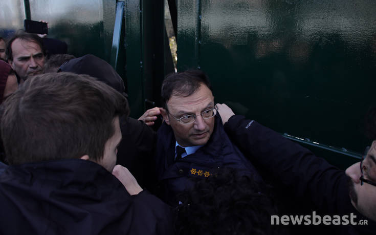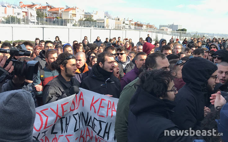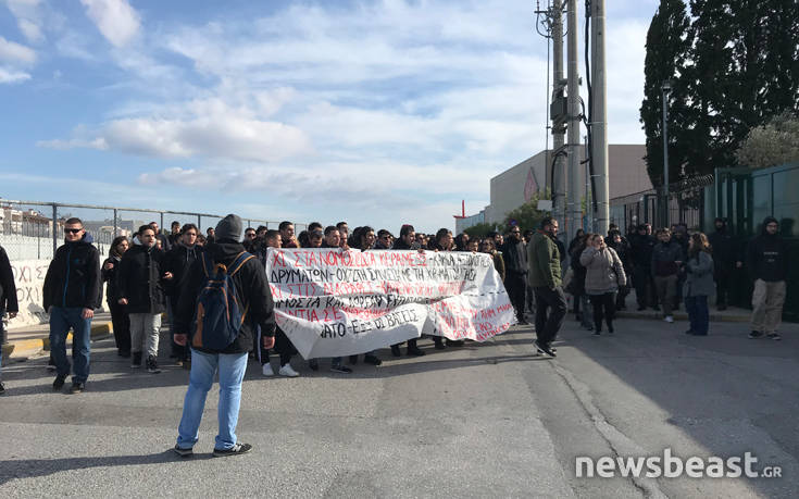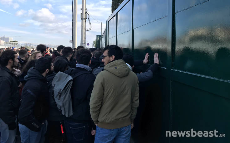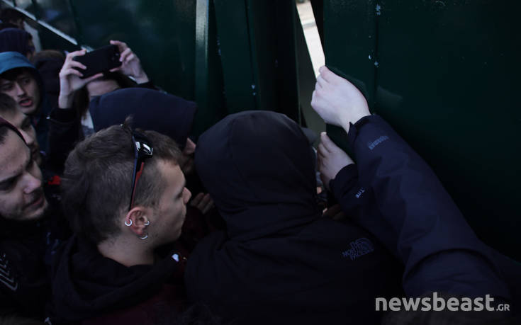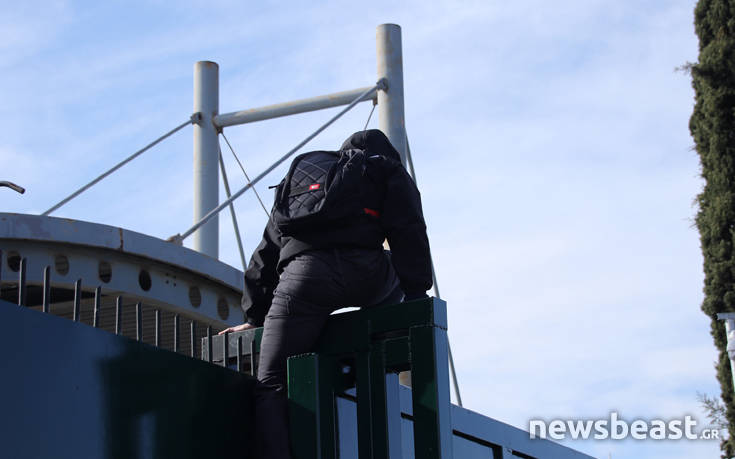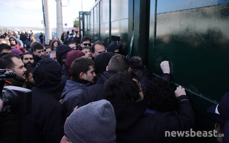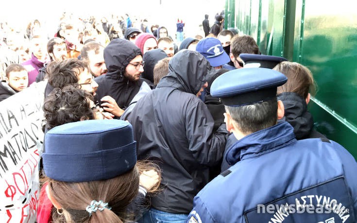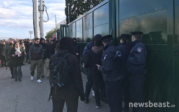 Στη μέσα πλευρά υπάρχουν δυνάμεις των ΜΑΤ σε απόσταση όμως από την πύλη και χωρίς να έχουν επέμβει.