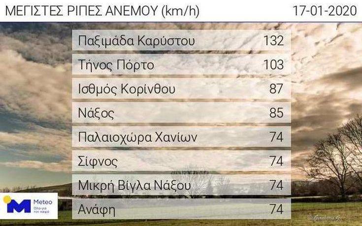 Χαρακτηριστικό είναι ότι στη Παξιμάδα Καρύστου η μέγιστη ριπή έφτασε τα 132 χλμ/ώρα και στο Πόρτο Τήνου στα 103 χλμ/ώρα.