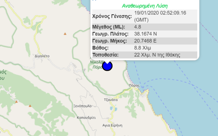 Σύμφωνα με το Γεωδυναμικό Ινστιτούτο του Εθνικού Αστεροσκοπείου Αθηνών, ο σεισμός είχε ένταση 4,8 Ρίχτερ, με το επίκεντρό του να καταγράφεται 22 χιλιόμετρα νότια της Ιθάκης κι 261 χιλιόμετρα δυτικά της Αθήνας.