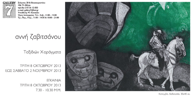 «Ταξιδιών χαράγματα» είναι ο τίτλος της δεύτερης ατομικής έκθεσης που παρουσιάζει η Αννή Ζαβιτσάνου στην Gallery 7, Σόλωνος 20 και Βουκουρεστίου.